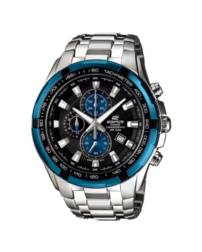 A sporty chronograph with a big face. The two-tone bezel, which looks like ion-plated stainless steel covered with separate parts, creates an overall dynamic design.