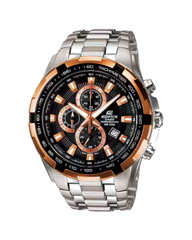 A sporty chronograph with a big face. The two-tone bezel, which looks like ion-plated stainless steel covered with separate parts, creates an overall dynamic design. The inclusion of rose gold accents on part of the hands, indices, inner dial, and bezel, etc. creates a rich, dual-color design.