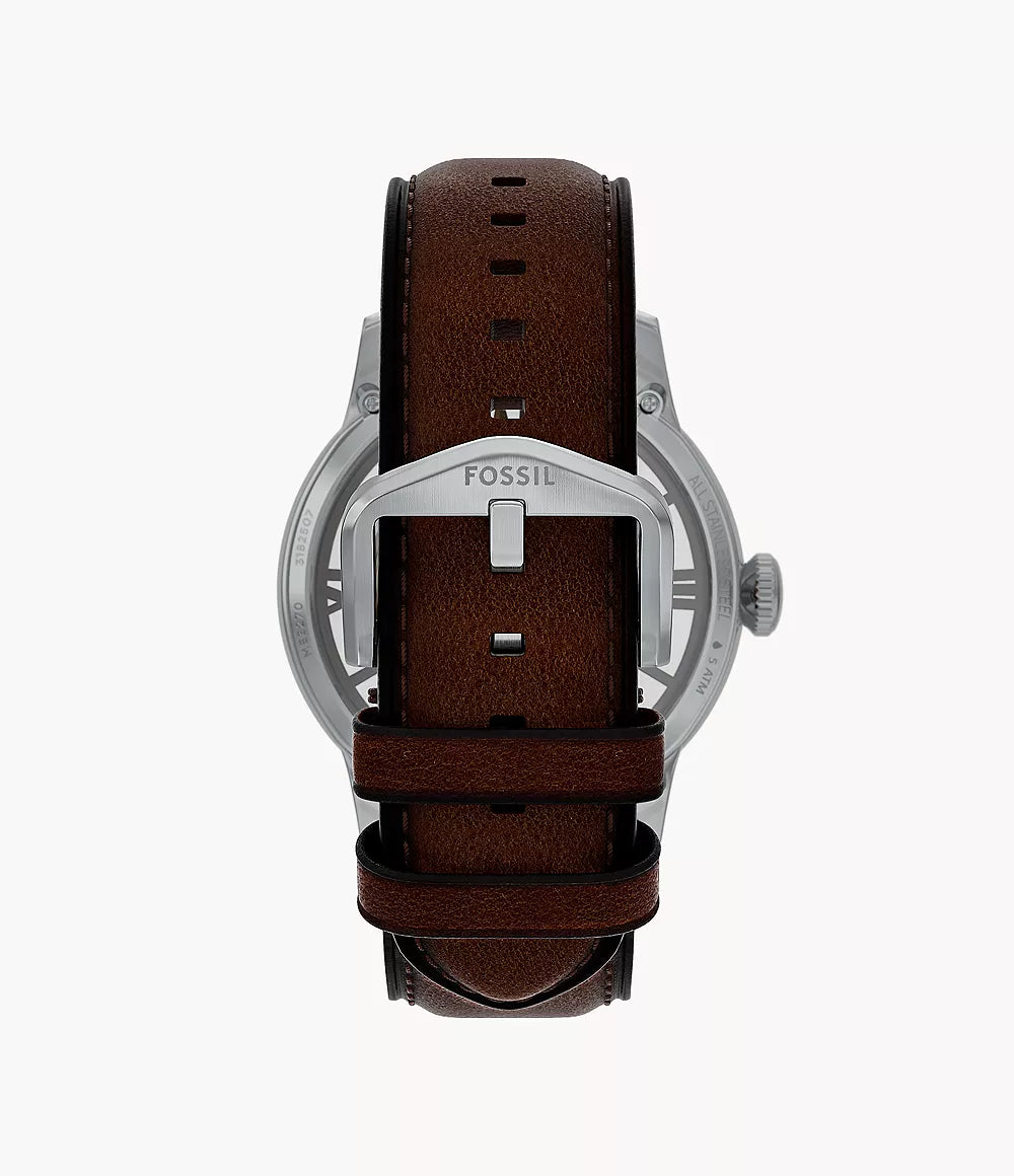 The Townsman watch is a modern icon, crafted to showcase the intricate automatic movement. The self-winding mechanism is exposed through a rich gray sunray skeleton dial delivering an uncompromising view of the inner workings. Created for precise timekeeping, it features a supple brown leather strap that offers a sleek and refined look. It's a true standout for effortless, everyday style.