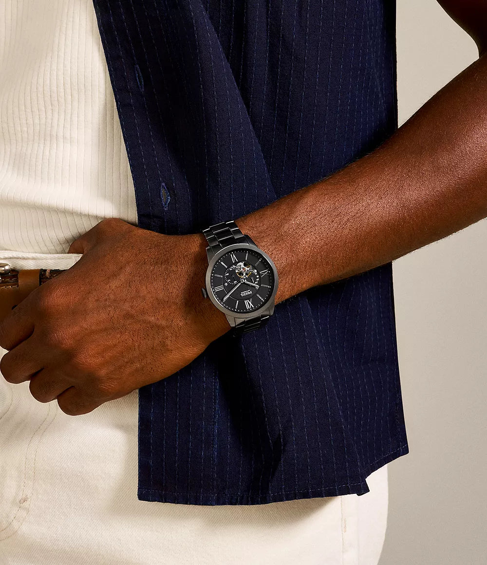 This 44-mm Townsman features a black satin dial with a see-through skeleton sub-eye, automatic movement and a smoke stainless-steel bracelet.